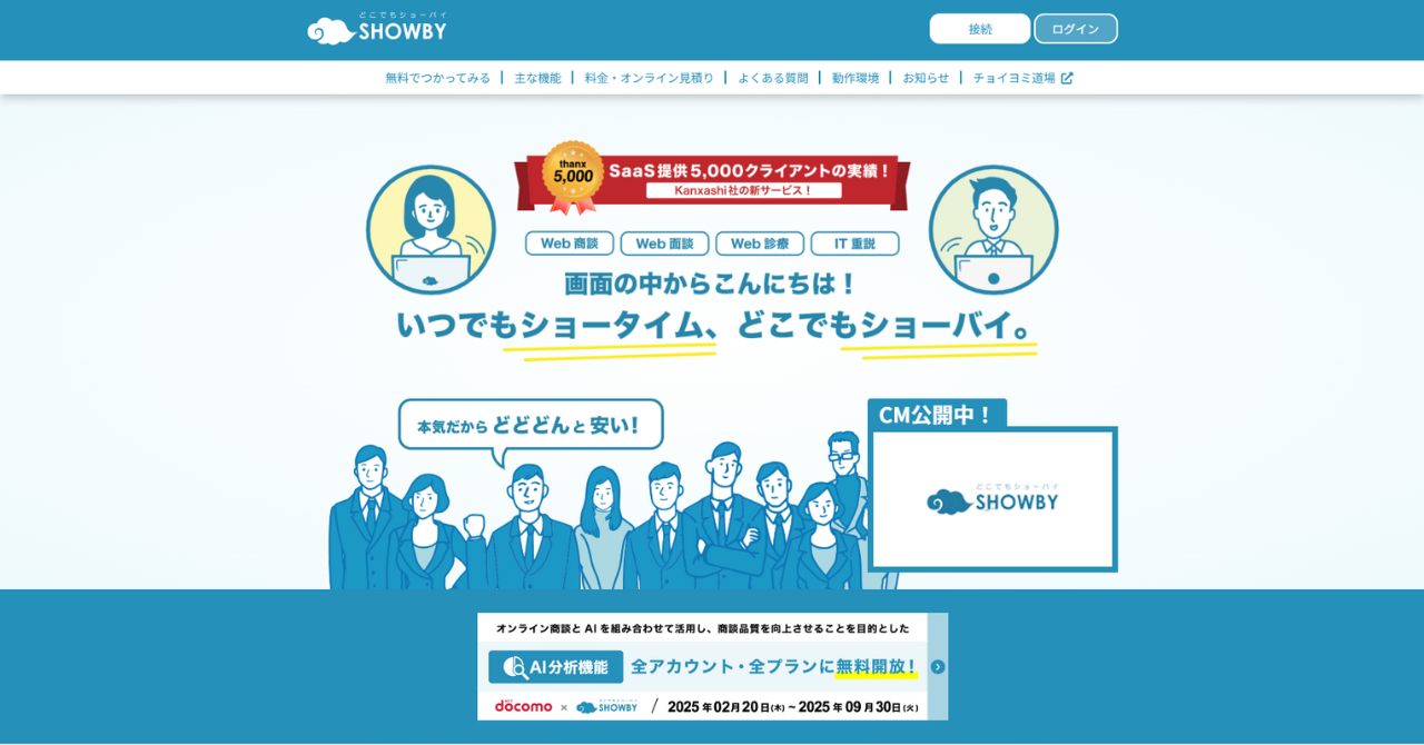 どこでもショーバイは、クラウド型のWeb商談ツールで、Web商談、Web面談、Web診療、IT重説などで活用されています。1体1の通常モードと、複数人での大部屋モードがあり、参加人数に合わせてモードを選べます。トークスクリプト(カンペ)機能や商談履歴機能など、商談をスムーズに進める便利な機能も充実しています。月間20商談までできる無料版もあるので、迷ったらまずは無料版で試してみる、ということも可能です。