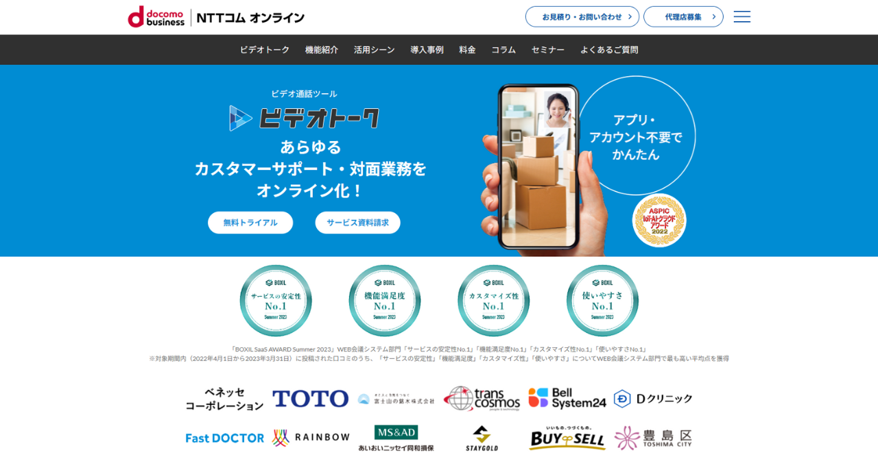 ビデオトークは、あらゆるカスタマーサポートや対面業務をオンライン化してくれるビデオ通話ツールです。B to C向けのツールで、例えば、自治体の住民相談、医療機関の診察や経過観察、カスタマーサポートや不動産のIT重説・内見、引っ越し等の見積もりやリユースの査定など、幅広いシーンで活用できます。