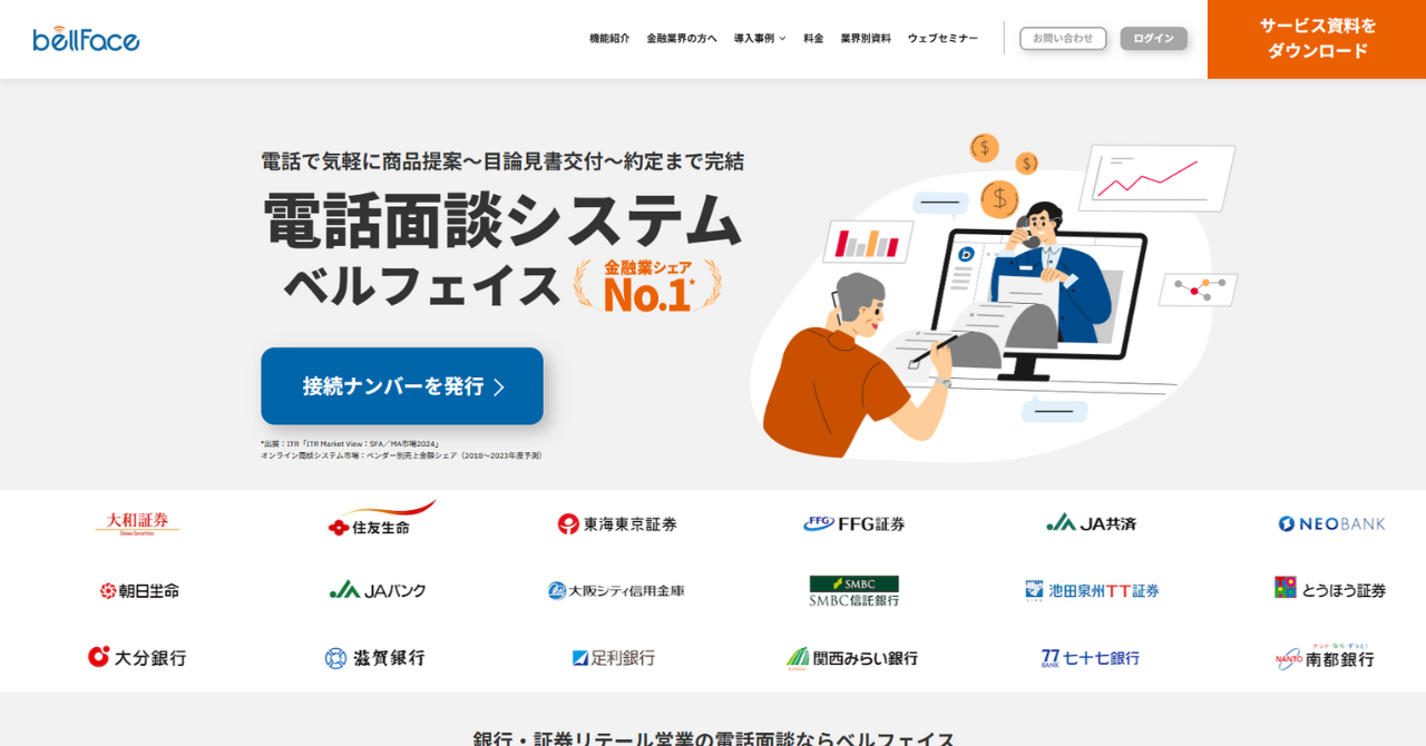ベルフェイスは、金融業シェアNo.1の電話面談システムです。大手金融機関でも実績がある安心のセキュリティで、契約情報や個人情報を扱うような商談、お客様サポートの場面でも安心して使えるオンライン商談ツールです。電話接続とWeb接続どちらの音声通話も可能なため、営業相手の環境やITリテラシーに関係なく、誰でも簡単に商談をスタートできます。