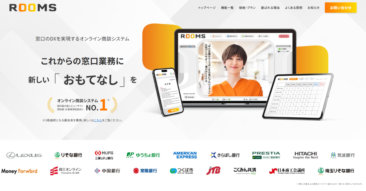 ROOMSは、窓口業務のDXを実現できるオンライン商談ツールです。リアルでの来店面談と、非対面でのWeb面談のハイブリッド型のオンライン窓口として、会って話せることと自宅で話せることを両立して実現できます。豊富なプレゼン機能と、商談の記録と分析で、商談管理も可能になります。