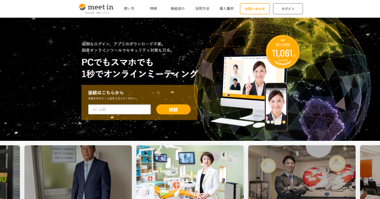 meet inは、国産のオンライン商談ツールでPCでもスマホでも1秒でオンラインミーティングを開始できます。画面共有や複数人接続だけでなく、契約書捺印、文字起こし、名刺表示などの機能もあります。商談だけでなく、オンラインでの採用面接など様々なシーンで活用されています。