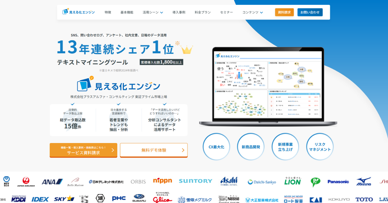 見える化エンジンは、13年連続シェア1位を誇るテキストマイニングツールです。InstagramやX (旧Twitter)などのSNSにある顧客の声を収集して分析できます。顧客の声の見える化だけでなく、潜在的なニーズも見える化し、新商品やサービスのヒントとして活用することも可能です。