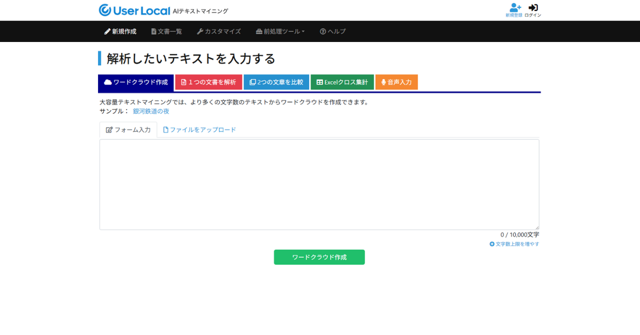 AIテキストマイニング by ユーザーローカルは、ブラウザ上で利用するテキストマイニングツールです。ワードクラウドの作成、単語出現頻度、共起キーワードの抽出、感情分析、などができます。まずは簡単にテキストマイニングを試してみたい方は試しに触ってみるとよいでしょう。