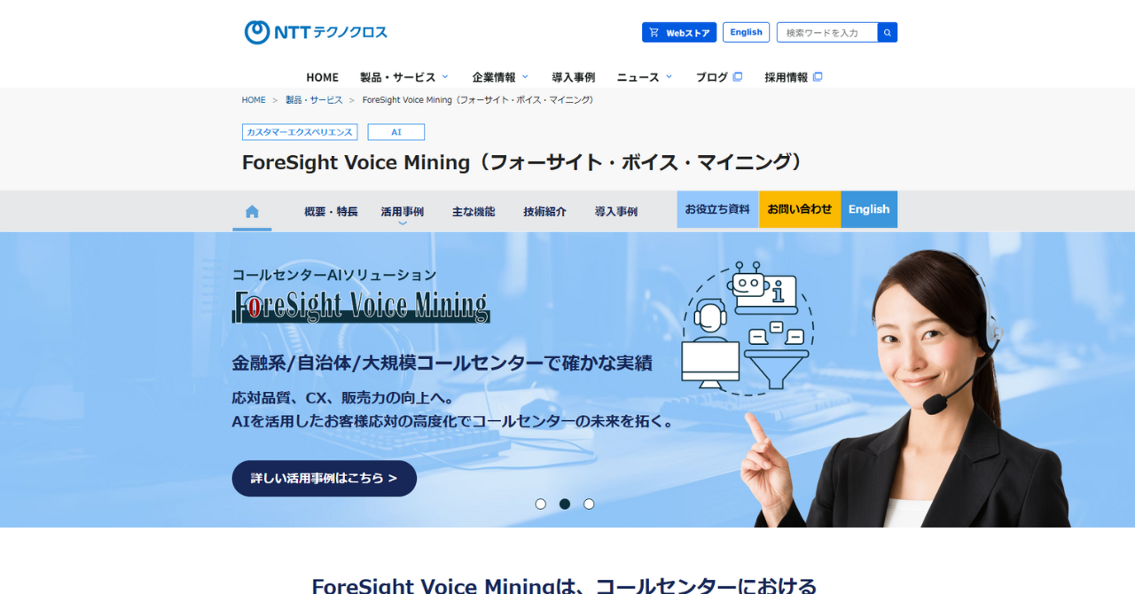 ForeSight Voice Miningは、NTTテクノクロスが提供しているサービスで、コールセンター業務をバックアップできる機能が充実しています。AIを活用した高度な音声認識で、押さえられた感情も判別できる高度な感情分析も可能です。分析するだけでなく、分析結果を活用するためのツールや機能がオールインワンで提供されており、使い勝手が良いのが特徴です。