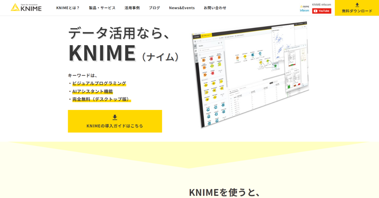 KNIMEは、ワークフロー型データ分析プラットフォームを提供してくれる無償のオープンソースソフトウェアです。データの加工・分析・可視化・レポーティングなど、データに関する様々な操作をノーコードで行えます。データ分析はもちろん、定型業務の自動化などもできるツールとなっています。