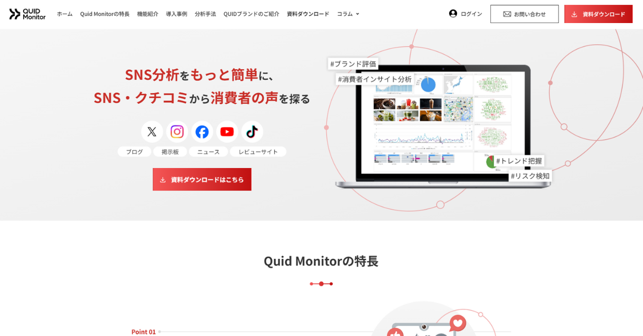 Quid Monitorは、SNSやブログ、ニュースや掲示板など国内10万ドメイン、世界3億ドメイン以上のデータソースに対応しており、日本語をはじめとして、英語、中国語、韓国語など50言語の分析も可能です。1か月分のデータであれば、数秒でデータ収集と分析が可能です。ツールの導入後も活用方法などを無制限で無料サポートしてくれたり、マニュアルも豊富に準備されています。