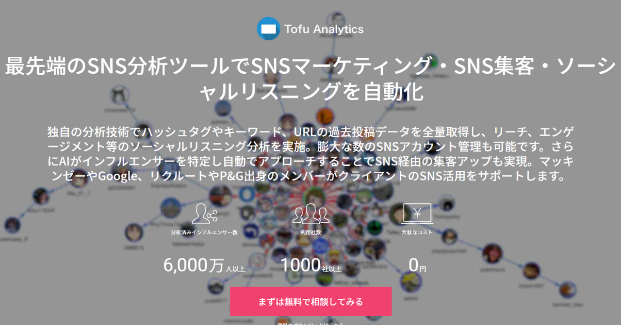 Tofu Analyticsは、ハッシュタグやキーワード、URLなどの過去の投稿データを取得して分析してくれるツールです。また、AIがインフルエンサーを特定して自動でアプローチすることも可能で、SNS経由での集客アップにも役立ちます。機能単位で契約するため、必要な機能だけ選んで契約することができ、また、契約期間の縛りもありません。