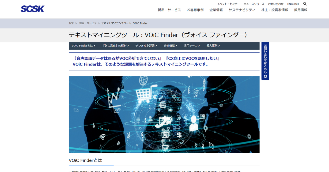 VOiC Finderは、「話し言葉」の分析に強いテキストマイニングツールです。様々な話し言葉を高精度・高速に分析するために、日産自動車と共同開発のもと誕生しました。10万語以上のデフォルト辞書に加えて、AI自動辞書作成機能によって、短い準備期間で確実に分析業務を開始できます。VOC分析、応対品質の自動評価や「ありがとう」率の自動算出、会話の要点を自動で抽出するようなオペレーターサポートなどの機能が搭載されています。