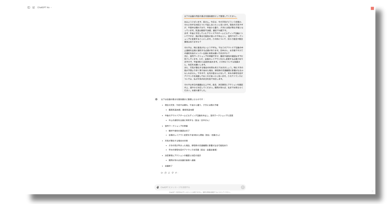 「要点を箇条書きにして」「口語は文語に変換して要約してください」など、文章の形式を指定すると、指示に沿った文章を出力させることができます。
