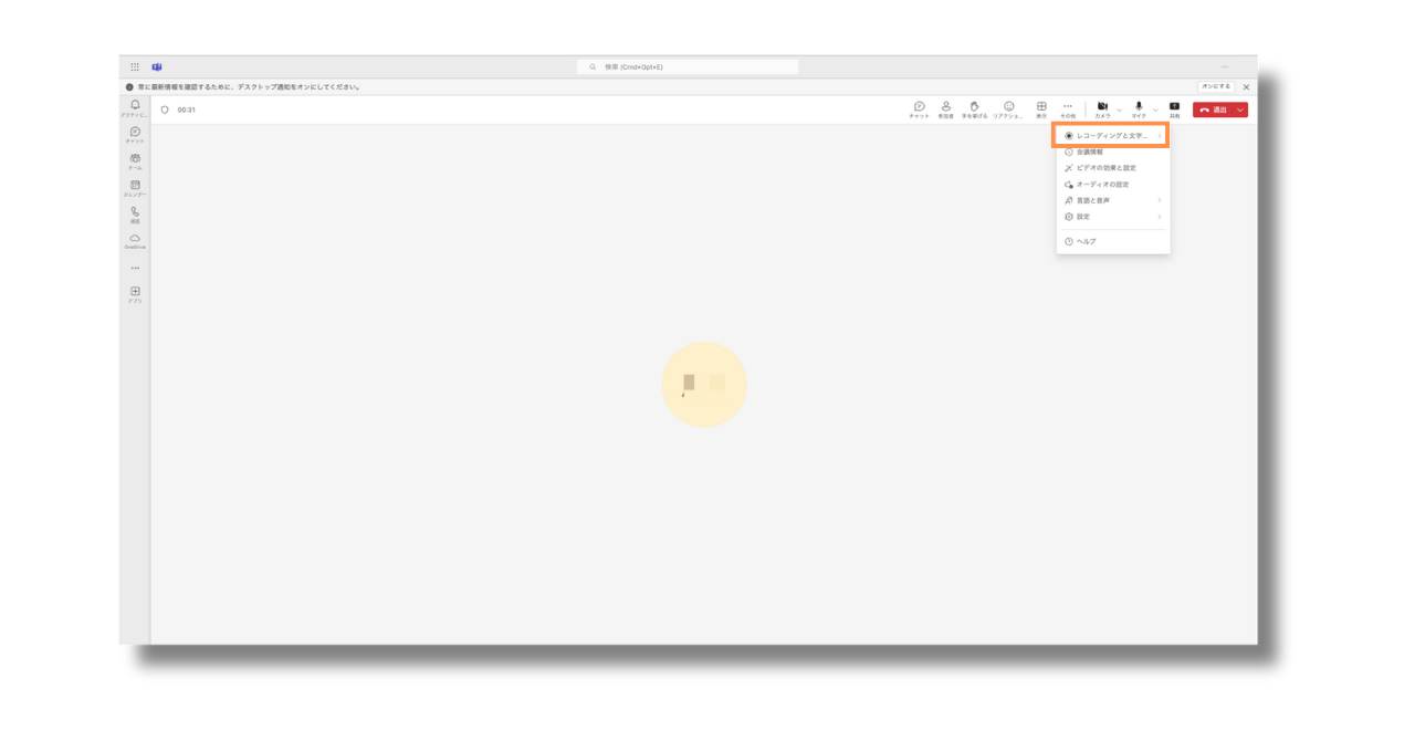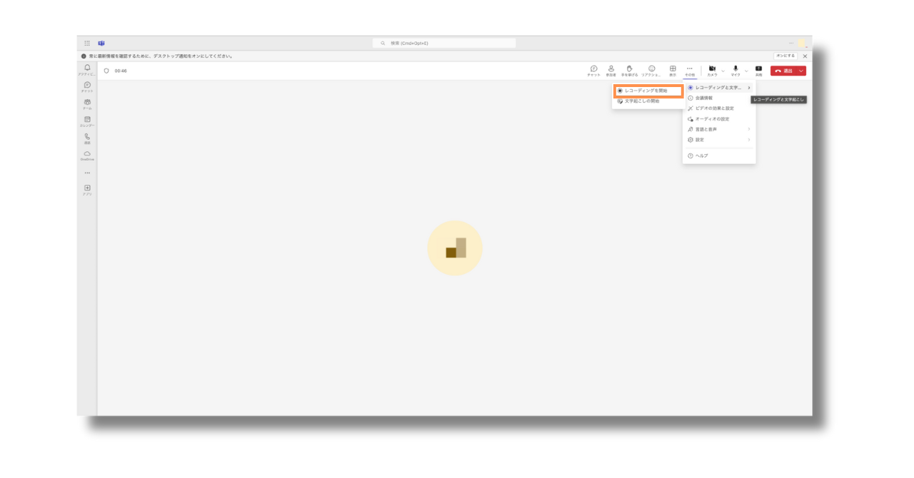 会議の録画が開始されると、会議に参加しているすべてのユーザーに対して、録画が開始されたことが自動的に通知されます。同じ手順で「レコーディングを停止」をクリックすると録画を停止できます。
