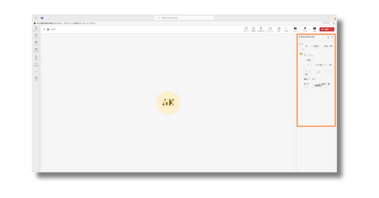 これでTeamsの録画が開始されます。また録画が開始されると下記画像のように自動で会議中の文字起こしが左側に表示され確認することができます。