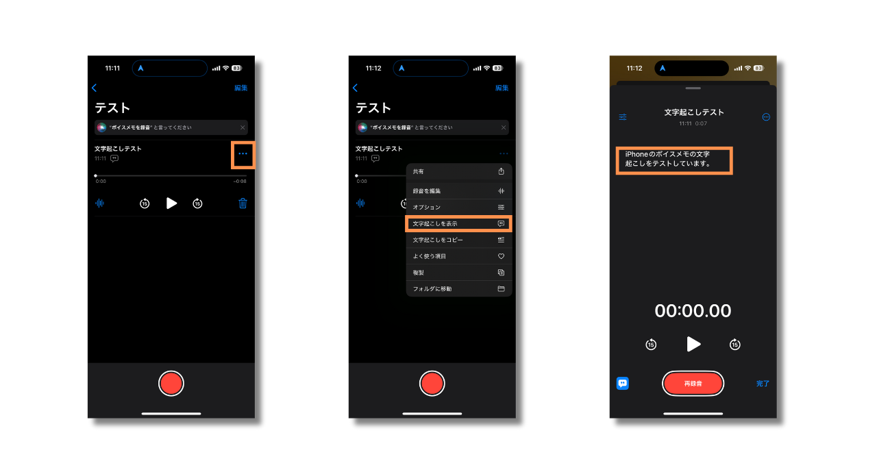 ボイスメモ上で録音した音声は、ボイスメモ単体で文字起こしが可能です。また、画像上のテキストは、iPhoneの標準機能であるテキスト認識表示機能をオンにすることで文字起こしできます。