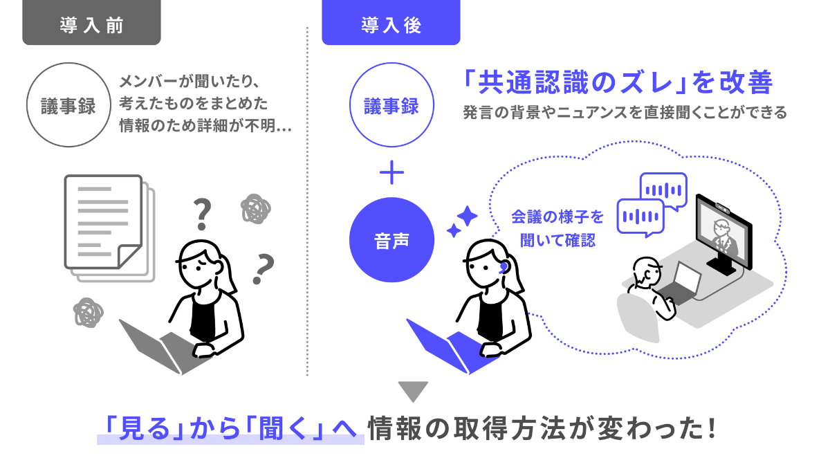 - 議事録の情報が「文字」から「音声」に変化し、書式や粒度を揃える必要がなくなった