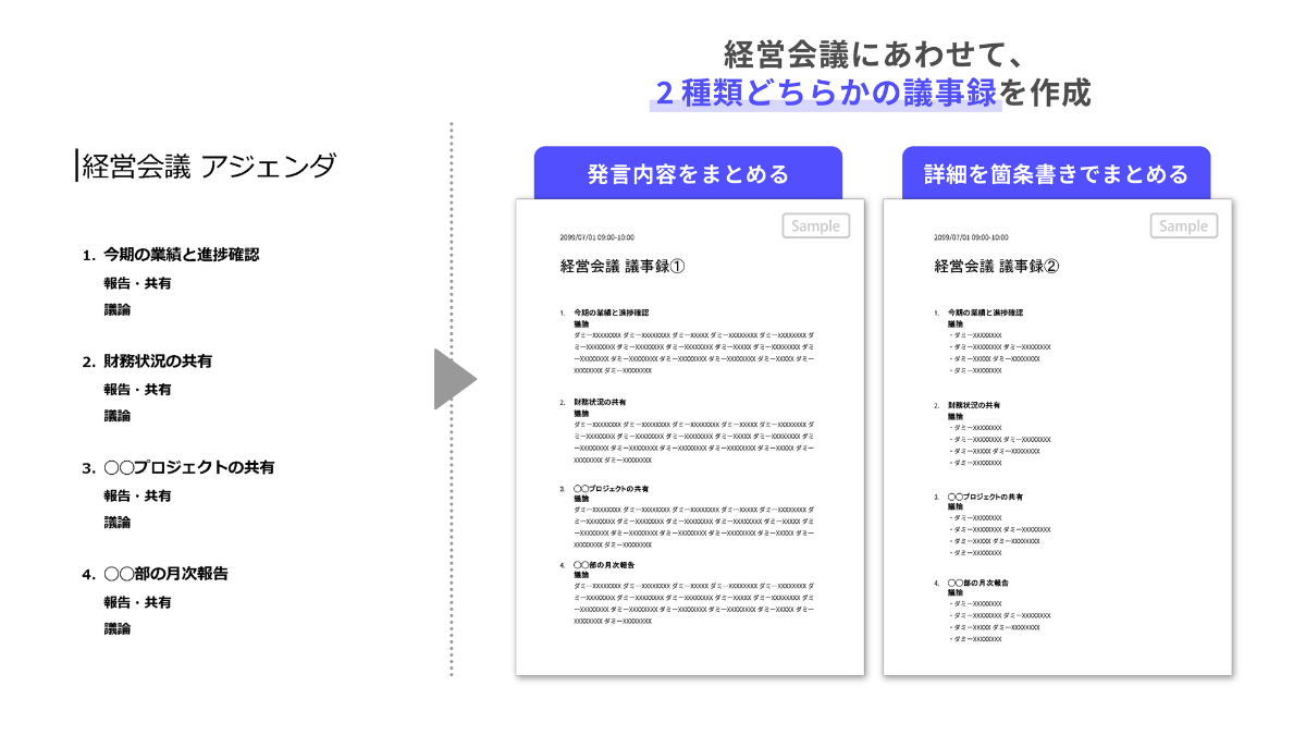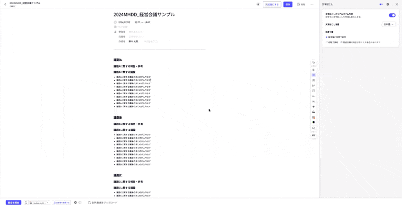 が可能なため、経営会議のような細かく発言をまとめる議事録の作成時間を大幅に削減することが可能です。