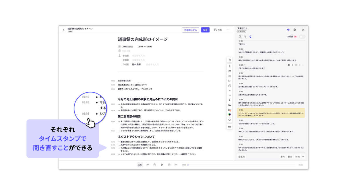 • 過去の会議音声から簡単に振り返りができるようになり、会議情報を財産として残すことができるようになった