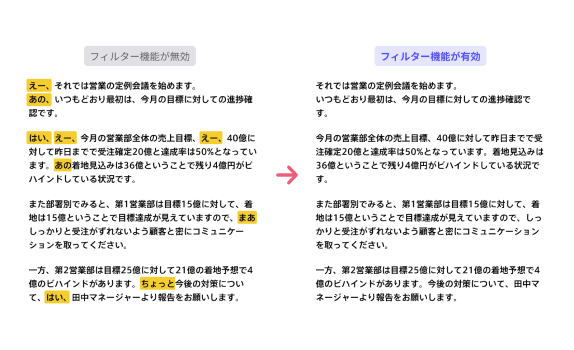 「あー」「えー」などの発話の間に挟み込む意味を持たない言葉を自動でフィルターにかけ、活用しやすい文章になります。